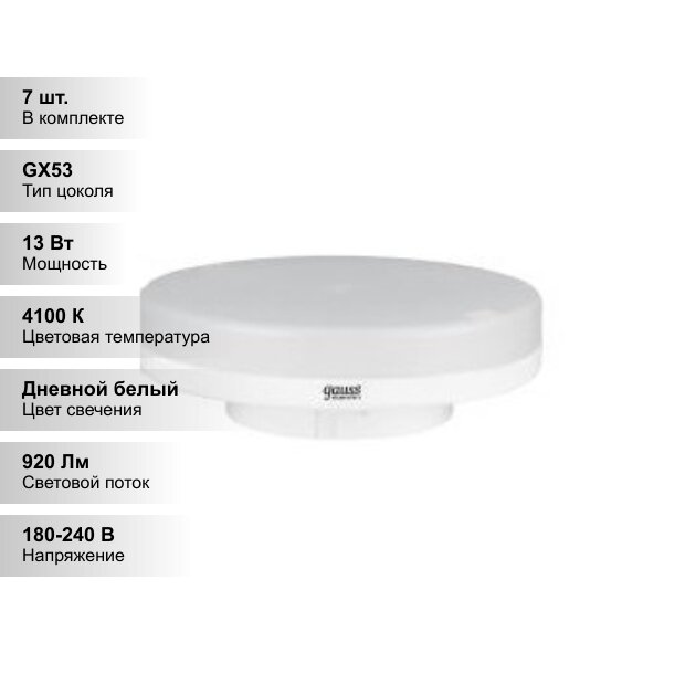 Купить (7 шт.) Светодиодная лампочка Gauss 13Вт 180-240В 4100K GX53