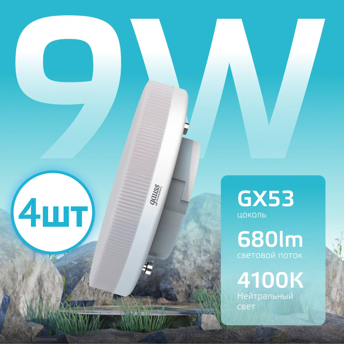 (4 шт.) Светодиодная лампочка Gauss LED Elementary, мощность 9 Вт, напряжение питания 180-240 В, цветовая температура 4100 K, нейтральный белый свет, цоколь GX53, размер 73х28.5 мм