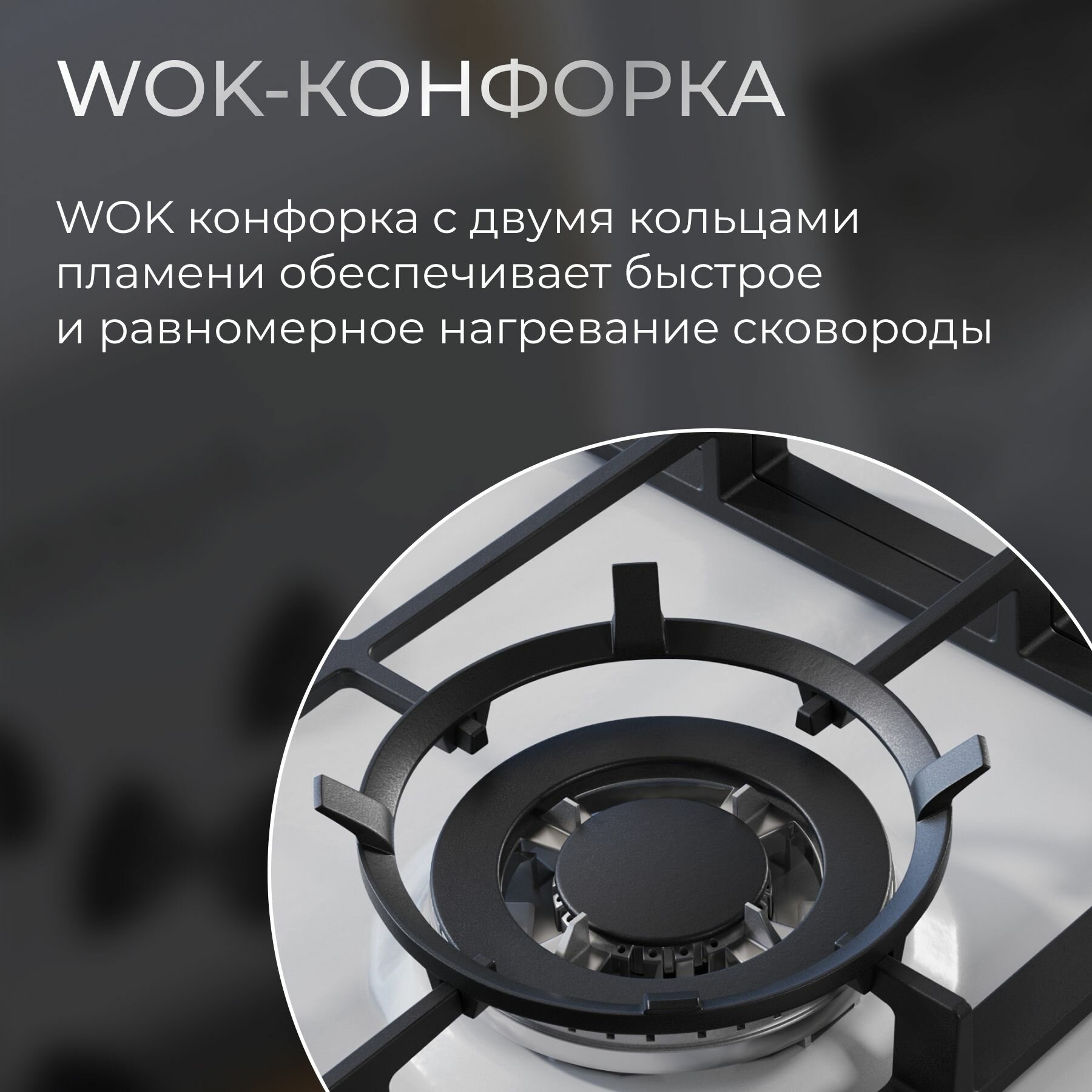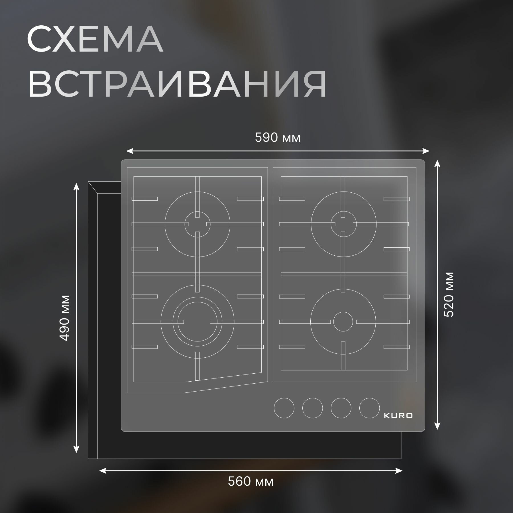 Газовая встраиваемая варочная панель 60 см KURO KHG 641 IX, газ-контроль, электроподжиг, WOK-конфорка, чугунные решетки, серебристая