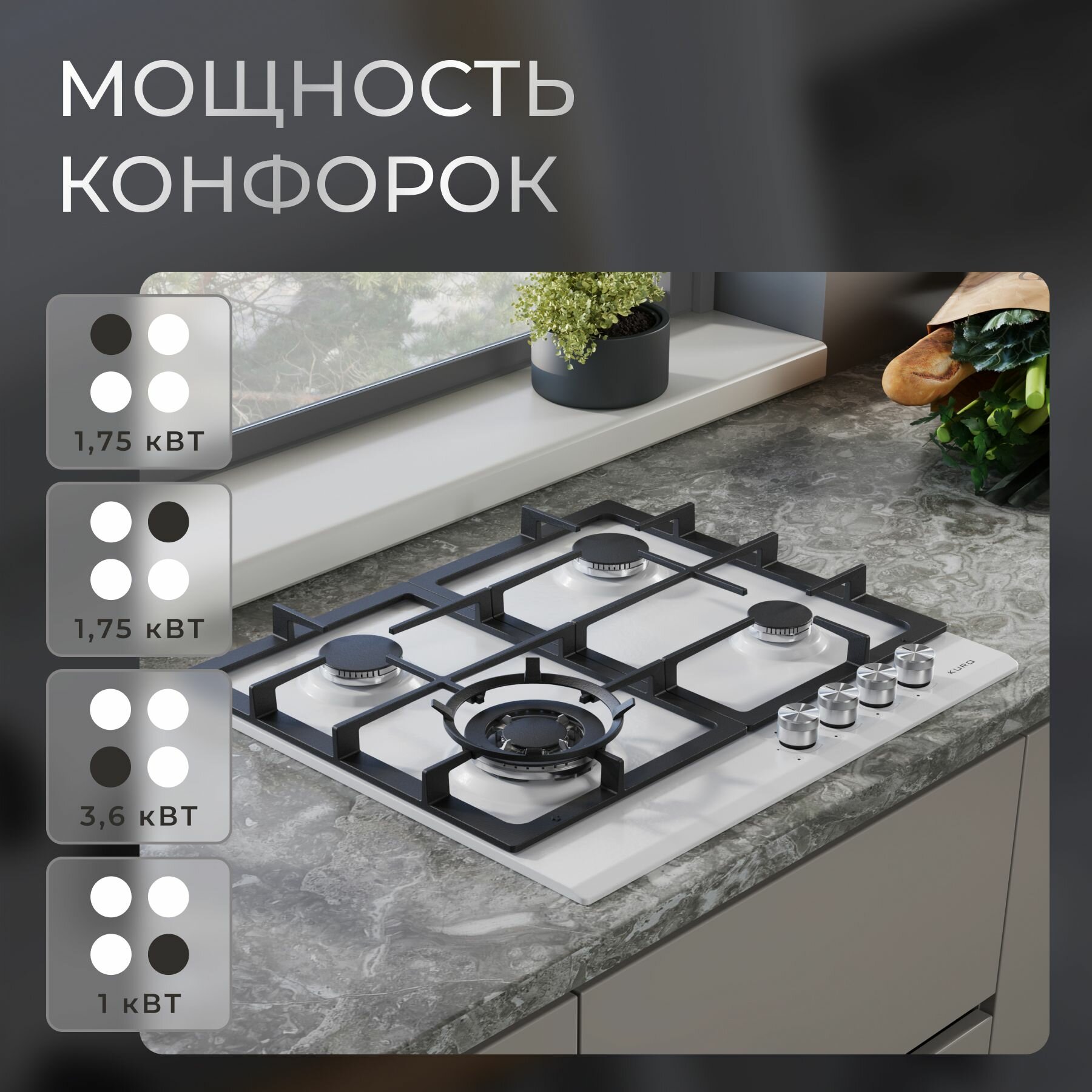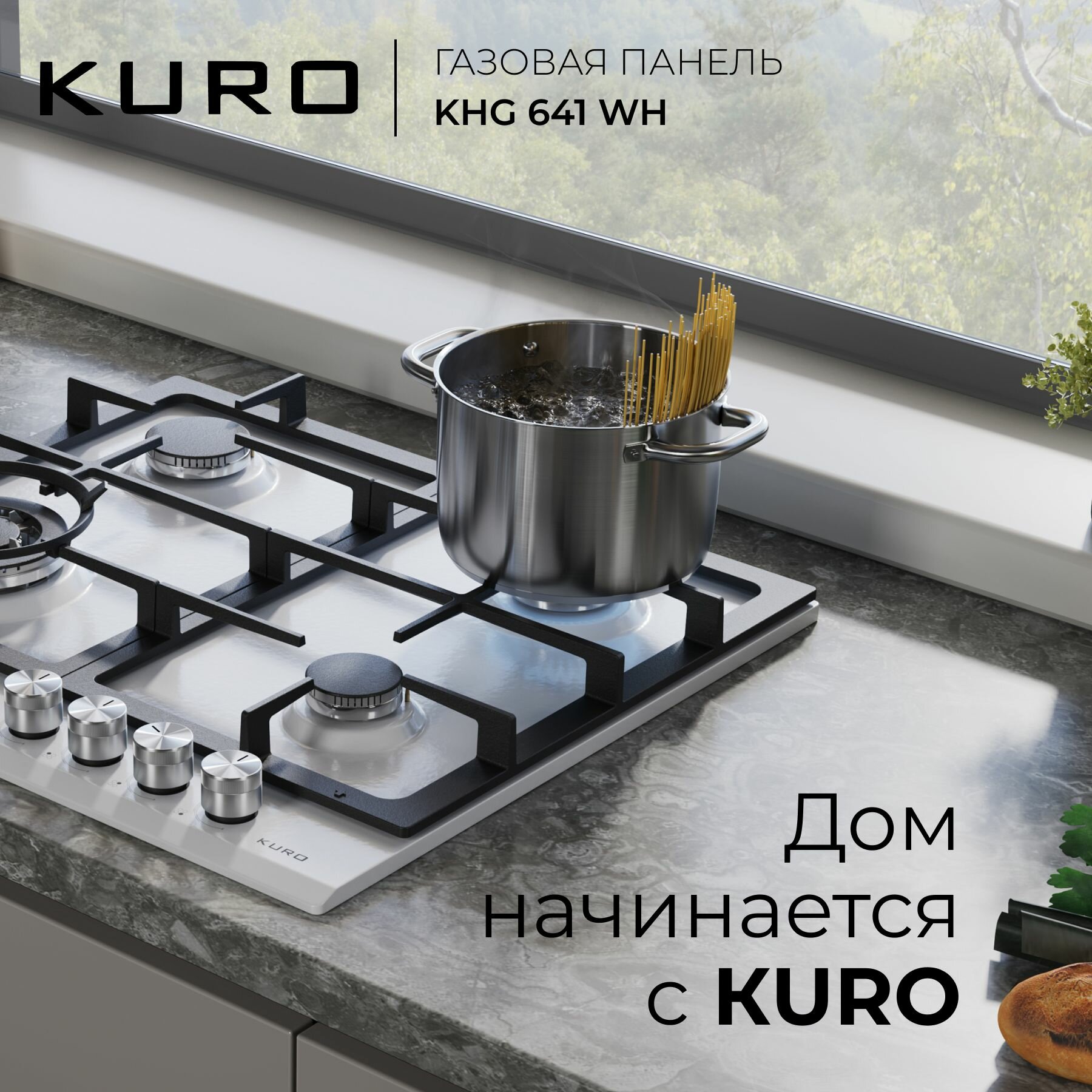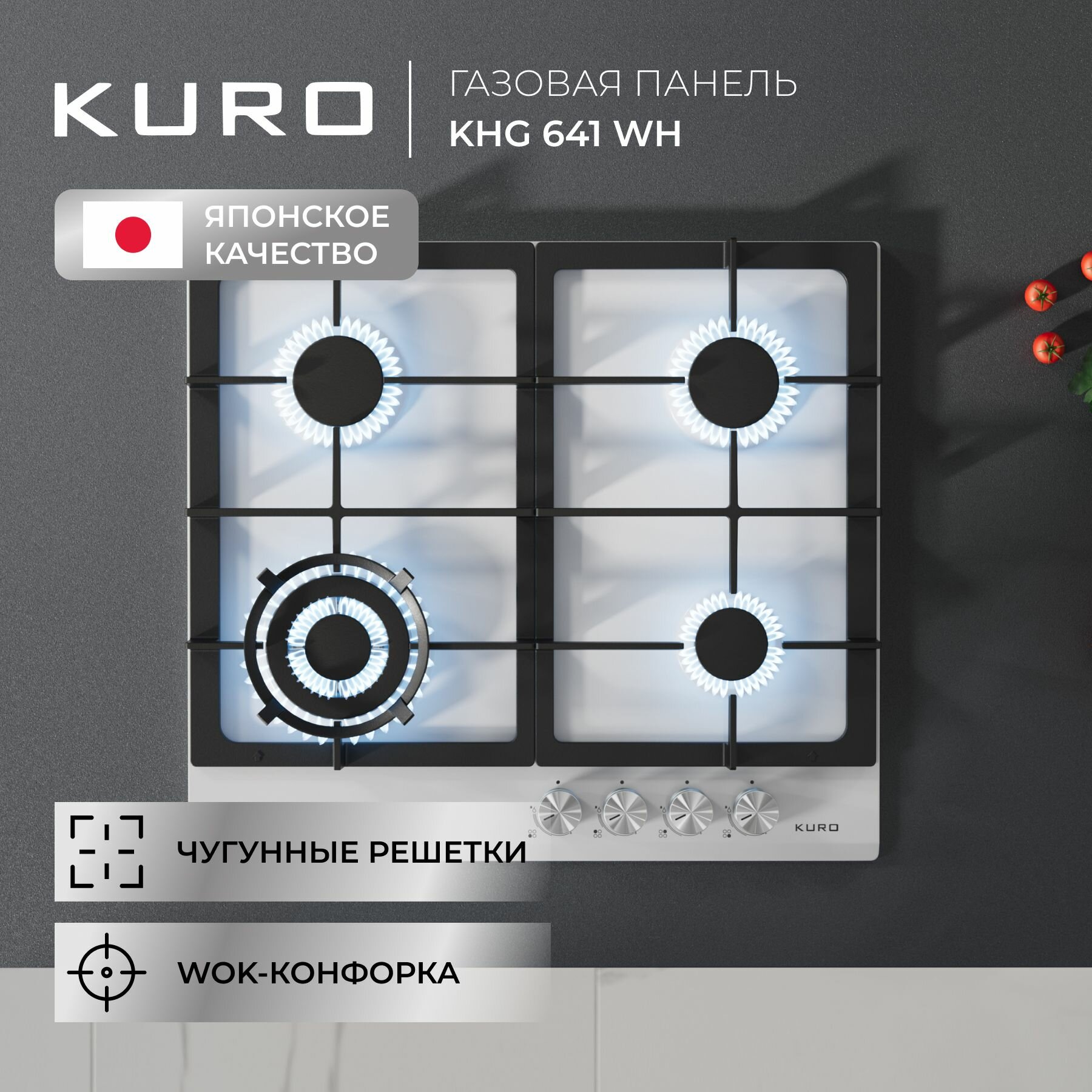 Газовая встраиваемая варочная панель 60 см KURO KHG 641 WH, газ-контроль, электроподжиг, WOK-конфорка, чугунные решетки, белая