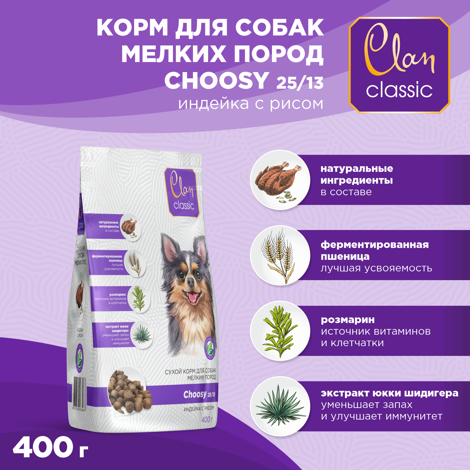 Купить Корм для собак мелких сухой CLAN Classic Choosy 25/13, индейка и рис, 400г