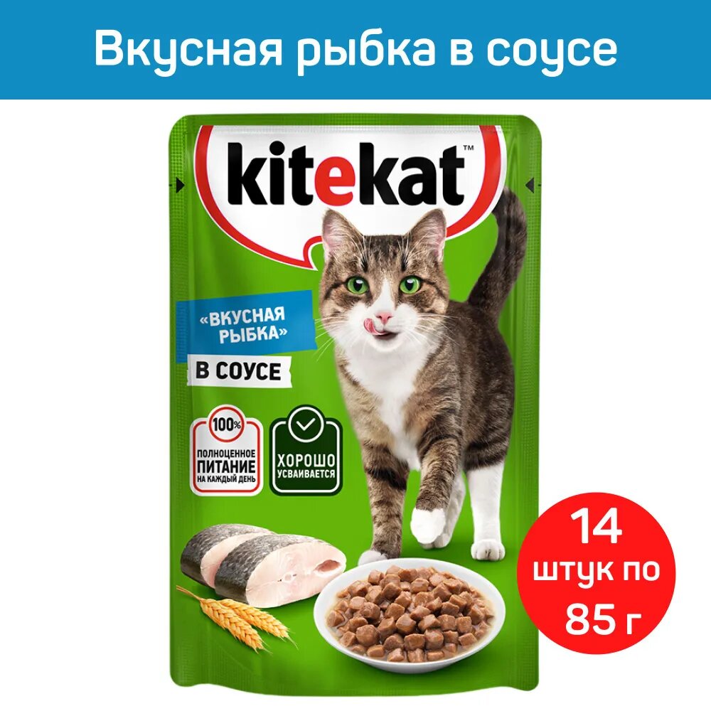 Влажный полнорационный корм KITEKAT для взрослых кошек, со вкусом рыбы в соусе «Вкусная рыбка», 56 шт по 85 г