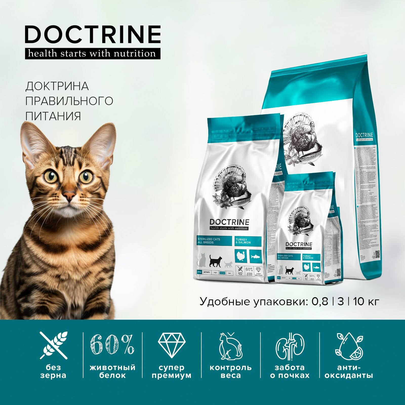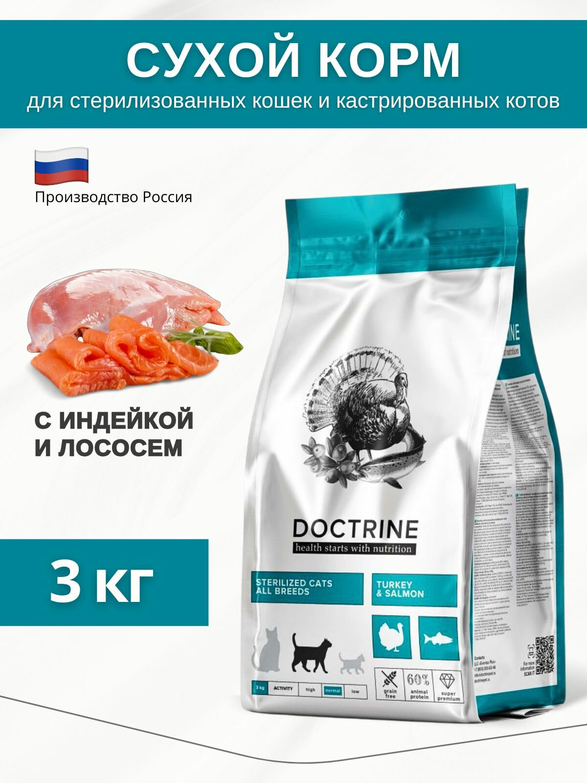Корм сухой Doctrine беззерновой, полнорационный для стерилизованных кошек и кастрированных котов с индейкой и лососем, 3 кг