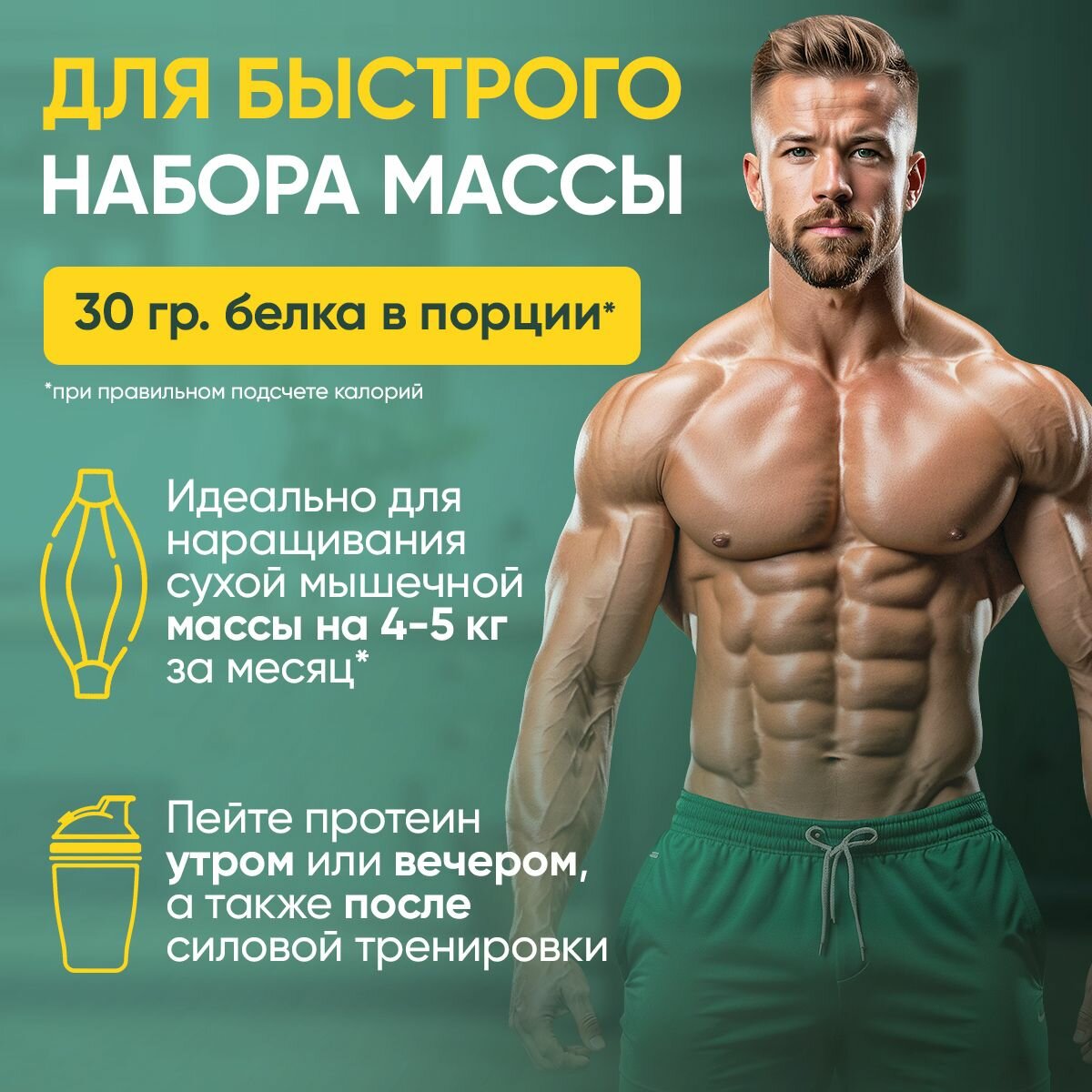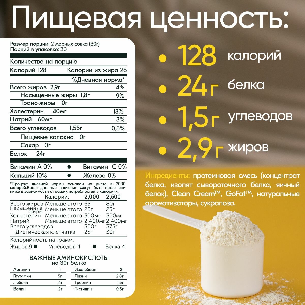 | Дополнительная информация | рекомендации по применению: Принимайте в зависимости от вашей диеты 1-4 раза в день(утром, за час до тренировки, после тренировки и перед сном), а также во время большого перерыва в питании. Смешайте 2 скупа с водой или вашим любимым напитком и выпейте!; размер порции в г(мл): 30; состав: яичный протеин, изолят сывороточного белка, концентрат сывороточного белка, кальций, аминокислотный комплекс (аргинин, глутамин, валин, треонин, изолейцин, лейцин, лизин, гистидин) |