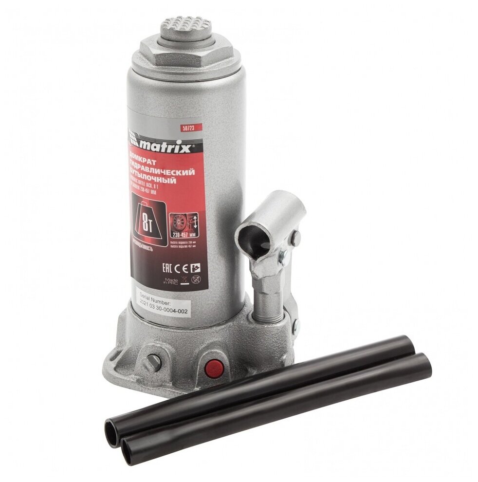 Домкрат гидравлический бутылочный, 8 т, высота подъема 230-457 мм Matrix (50723)