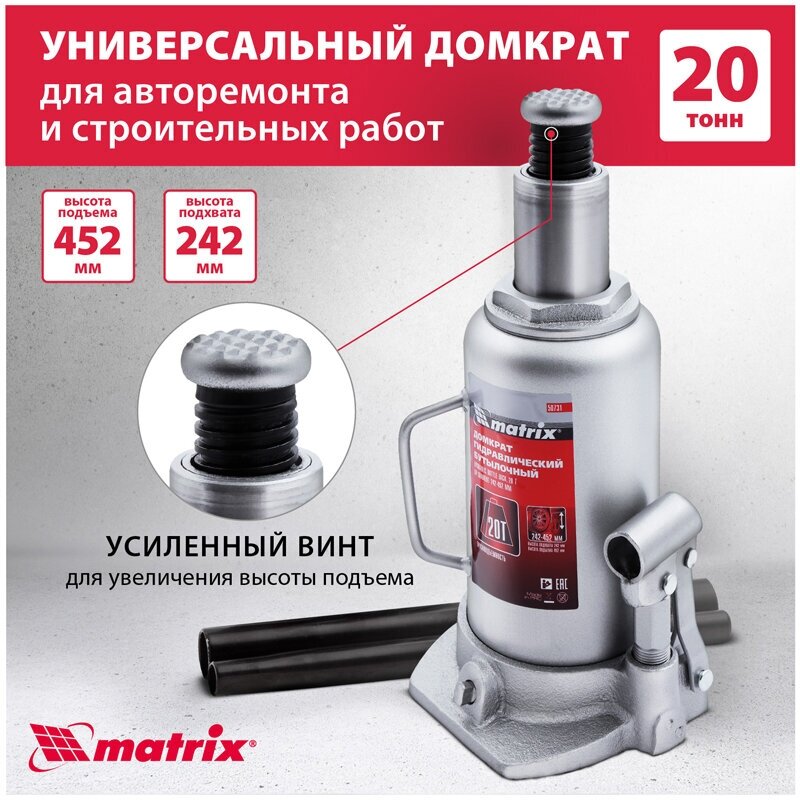 Купить 50731_Домкрат! Гидравлический Бутылочный, 20Т, H Подъема 242-452Мм Matrix арт. 50731