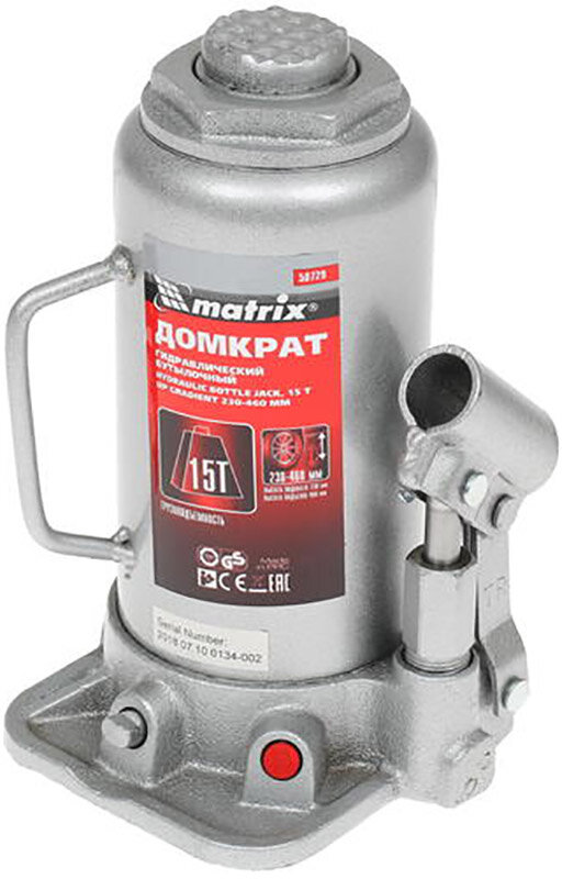 Домкрат гидравлический бутылочный, 15 т, высота подъема 230-460 мм, MATRIX Master 50729 50729
