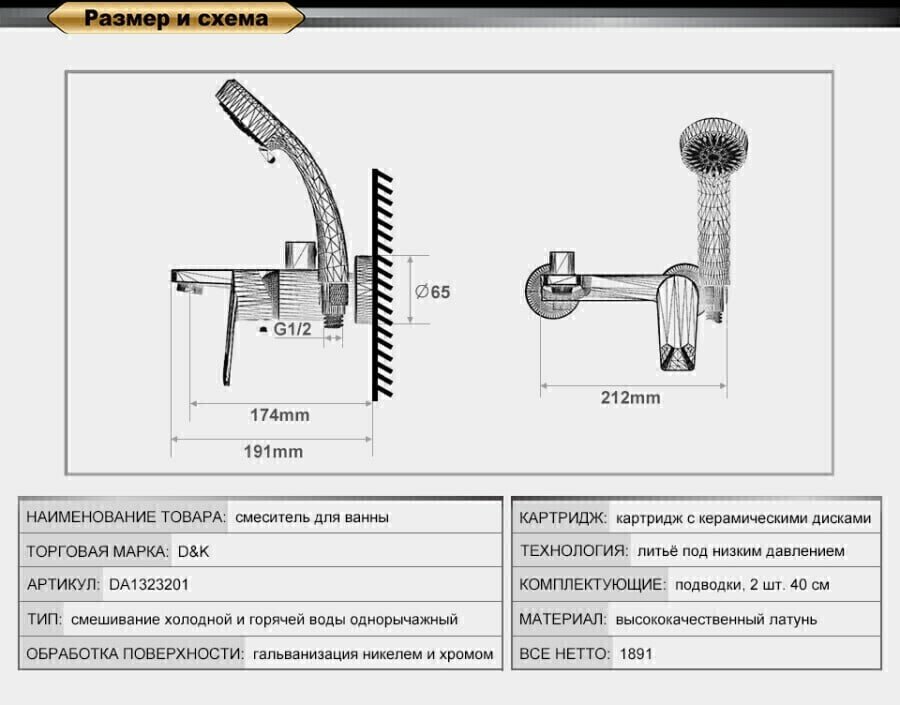 Смеситель для ванны с душем d&k rhein.Lessing Da1323201 короткий излив хром