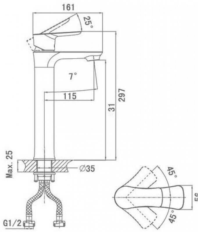 | Угол поворота рукоятки вертик. | 25 градусов |