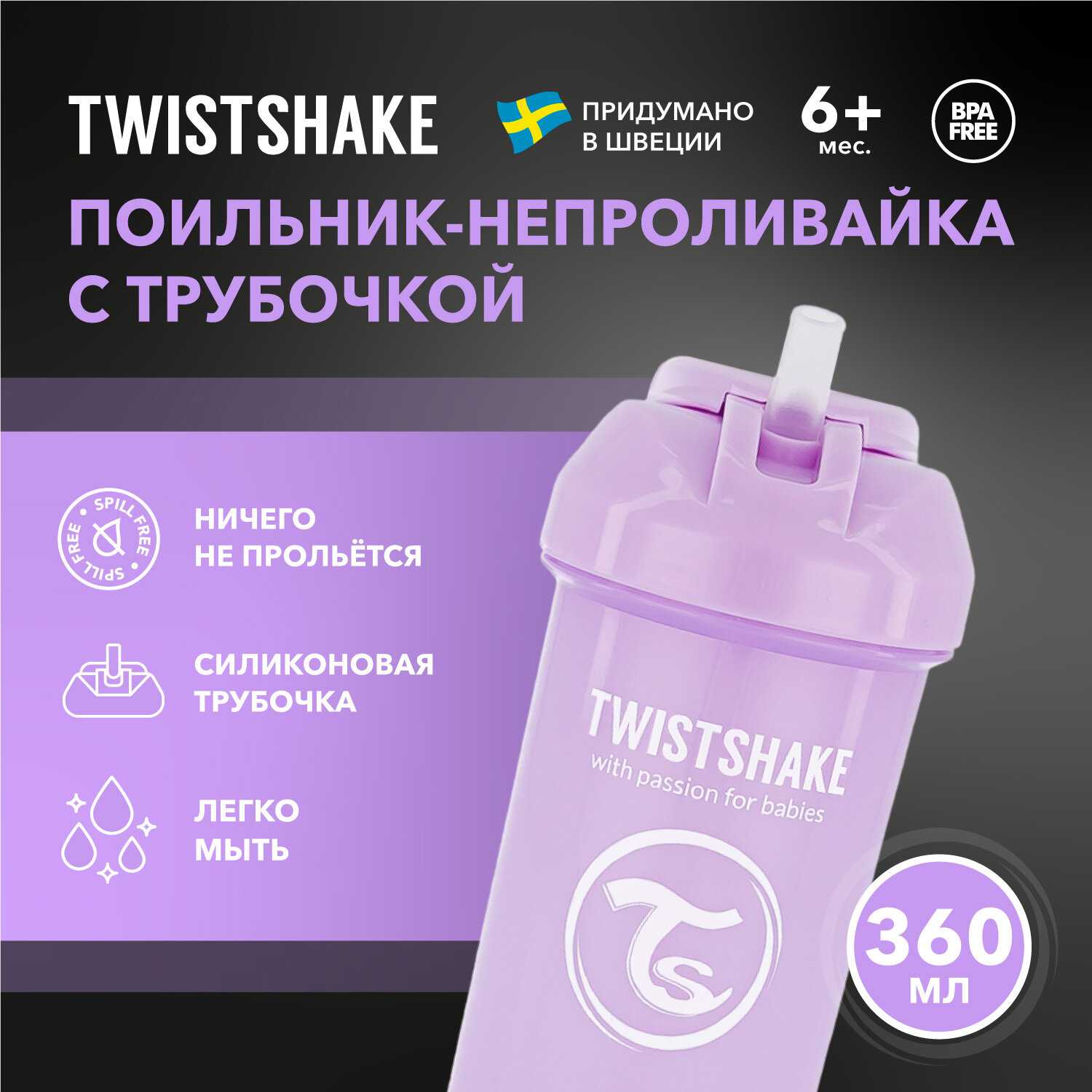 Поильник непроливайка детский с трубочкой 360мл, от 6+мес.Twistshake, цвет: фиолетовый (Pastel Purple)
