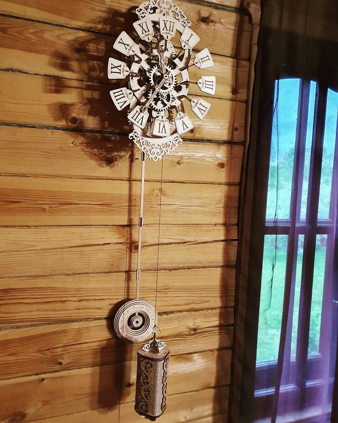 | Отзыв: | Собирал целый день: процесс довольно увлекательный. Пару раз ошибался, но можно пересобрать, благо сборка без клея и т.п. Местами детали плоховато вырезаны, особенно мелкие и при этом самые хрупкие: парочку надломил и обкрошил углы при выемке из листов фанеры. Собрал, повесил на стену, под воздействием груза высвобожденный механизм лихо крутится, а вот подключив маятник, колебания затухают спустя секунд 10-20. Я и молотки вешал, и бутылки с водой добавлял, потом заново разобрал и всё ещё раз промазал парафином и результата 0 |
