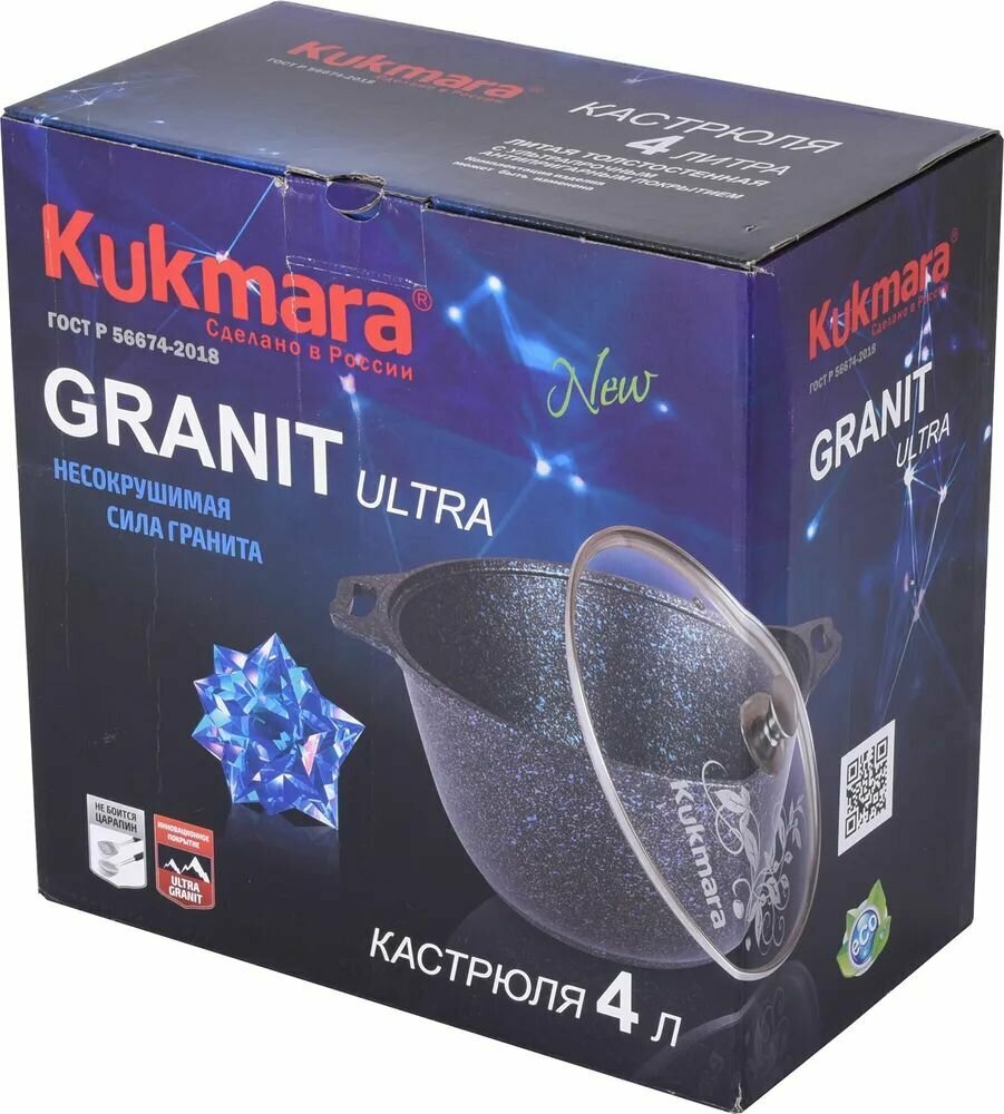 Кастрюля KUKMARA Granit ultra original литая 4,0 л со стеклянной крышкой