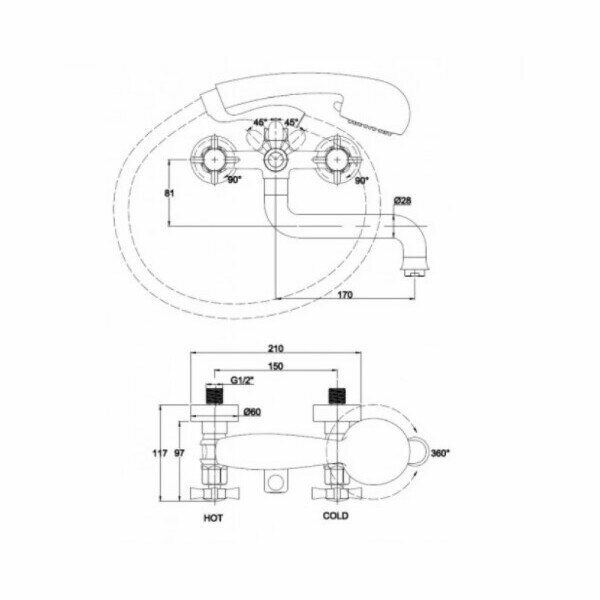 Смеситель для ванны с душем KAISER Cross - 41022 (двухвентильный, цвет хром)