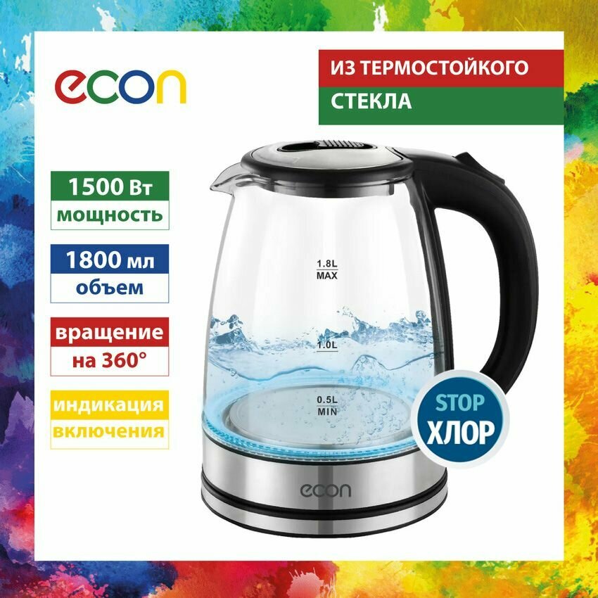 Чайник электрический ECON ECO-1836KE с подсветкой, 1,8 л, стеклянный, автоотключение, 1500 Вт интересное: