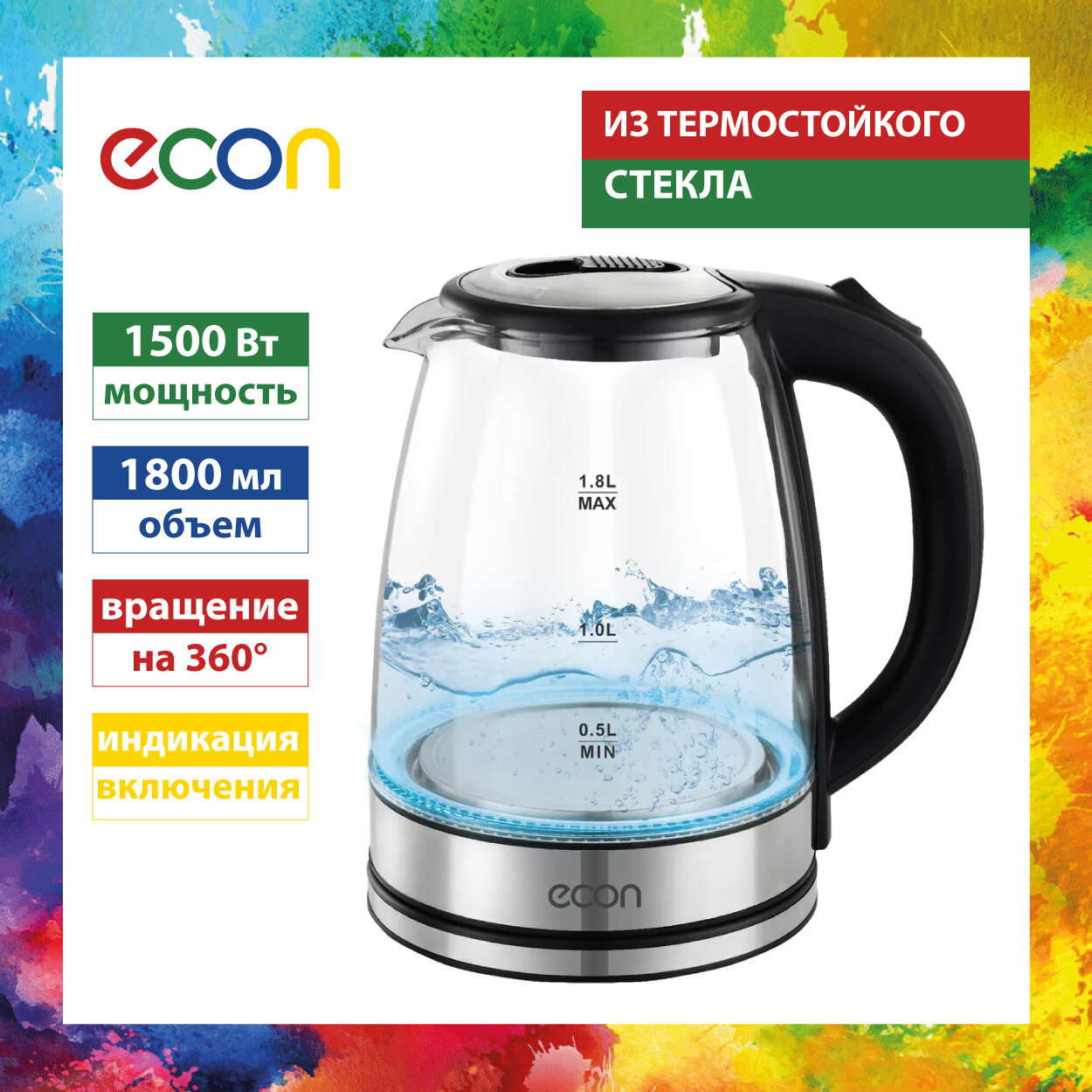 Купить Чайник электрический ECON ECO-1836KE с подсветкой, 1,8 л, стеклянный, автоотключение, 1500 Вт