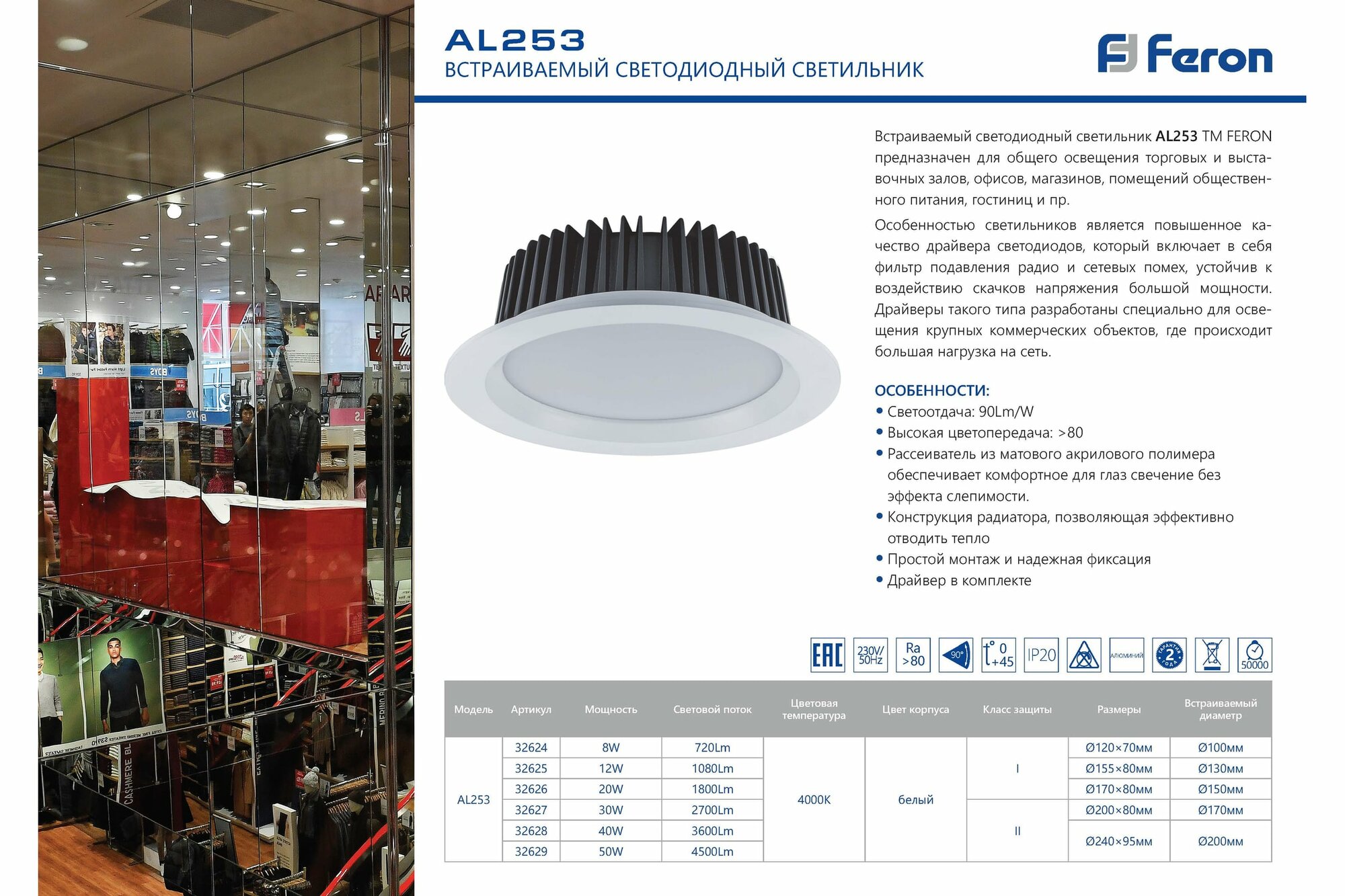 Светильник встраиваемый Feron светодиодный 20W, 1800Lm, 4000K, 90 градусов, белый, AL253 с драйвером в комплекте