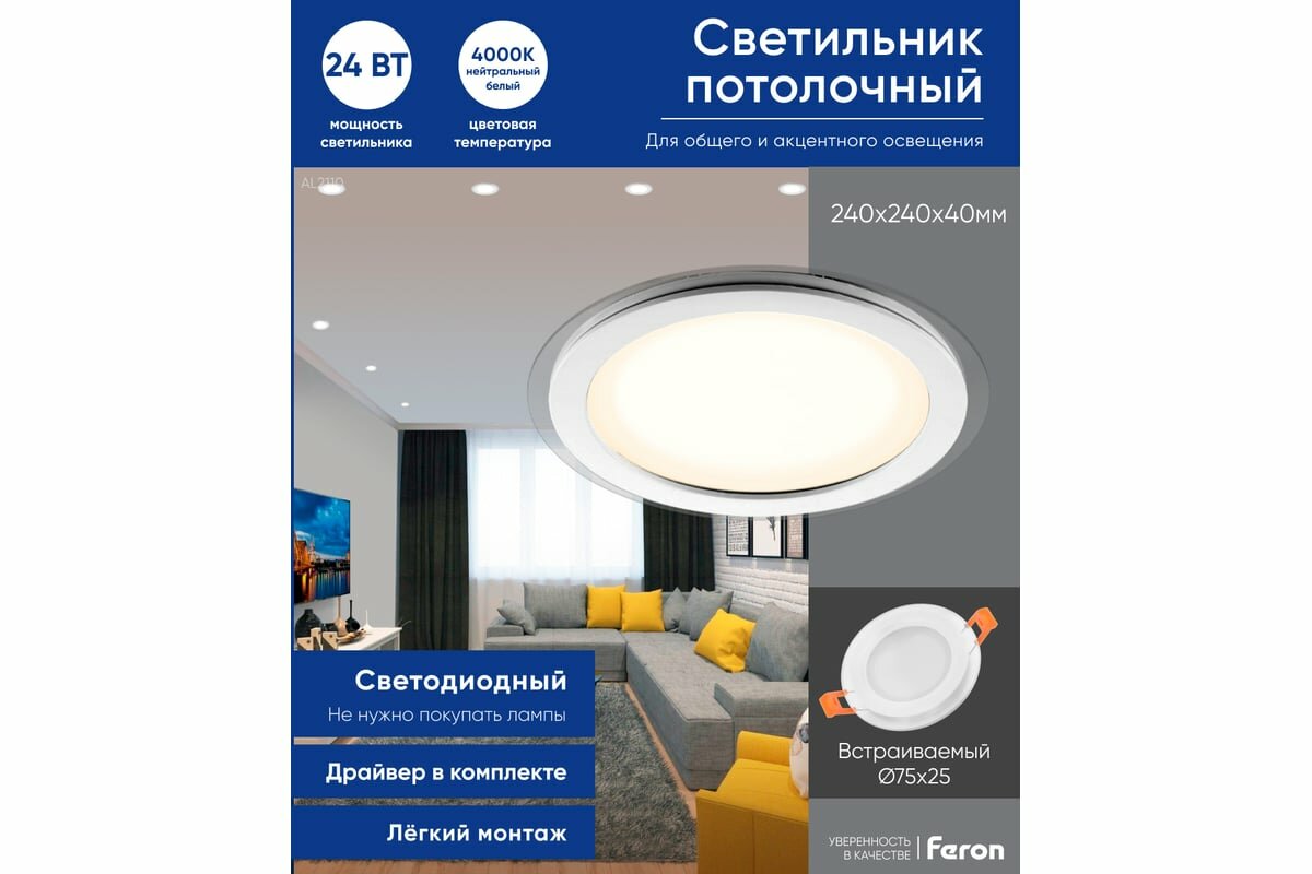Ниже Вы можете прочитать отзывы на Светодиодный светильник Feron AL2110 встраиваемый 24W 4000K белый (28968), ознакомится с подробными характеристиками, посмотреть интересные обзоры и фотографии на Светодиодный светильник Feron AL2110 встраиваемый 24W 4000K белый (28968).
