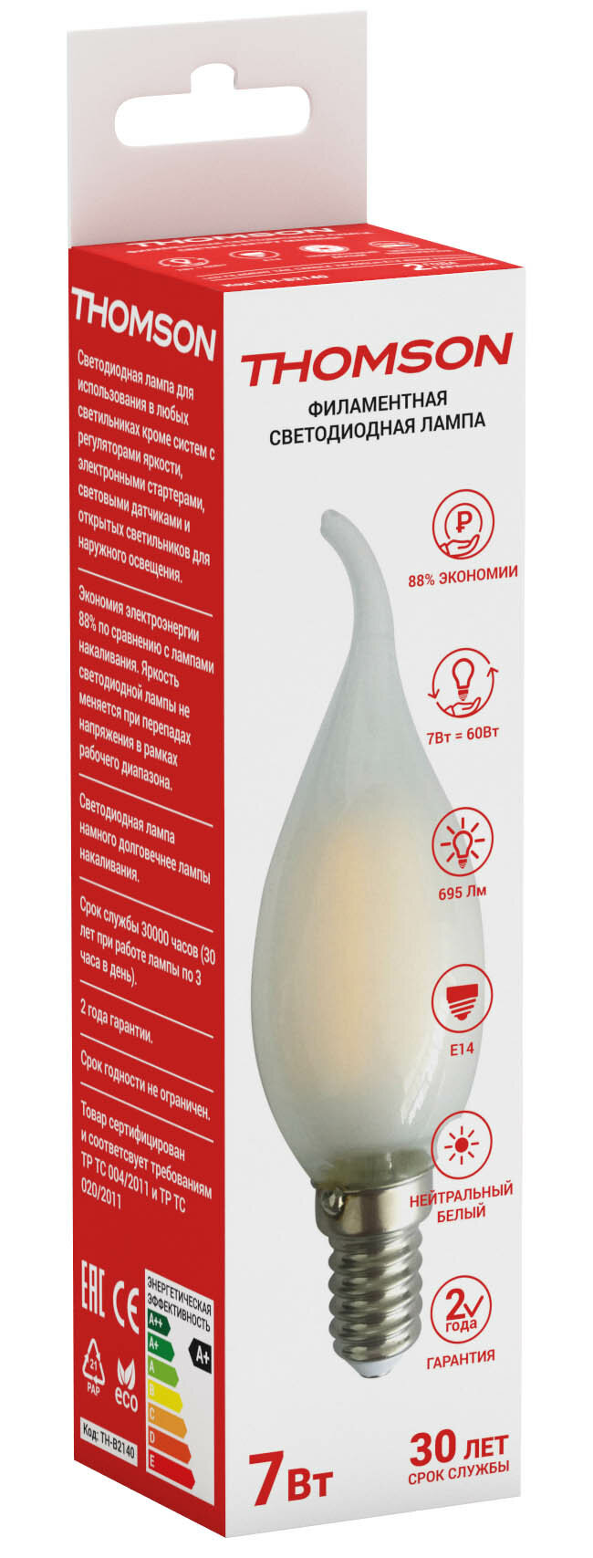 Купить Лампа филаментная Thomson E14, свеча на ветру, 7Вт, 4500К, белый нейтральный, 1 шт.
