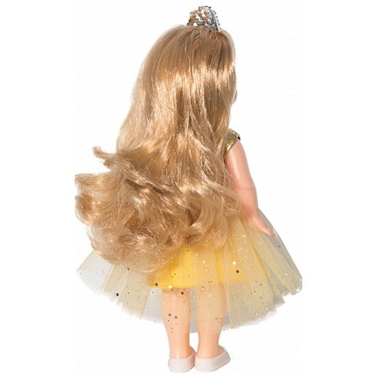 | Комплектация | кукла в одежде (нарядное, золотистое, пышное платье из трикотажной парчи и сетки с блестками), диадема, туфельки |