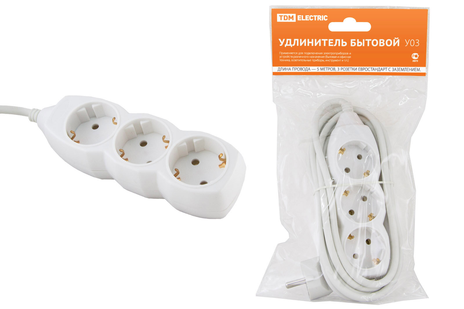 TDM SQ1303-0002 Удлинитель бытовой У03 3 гнезда, 5метров, с заземлением ПВС 3х1 мм2 16А/250В .