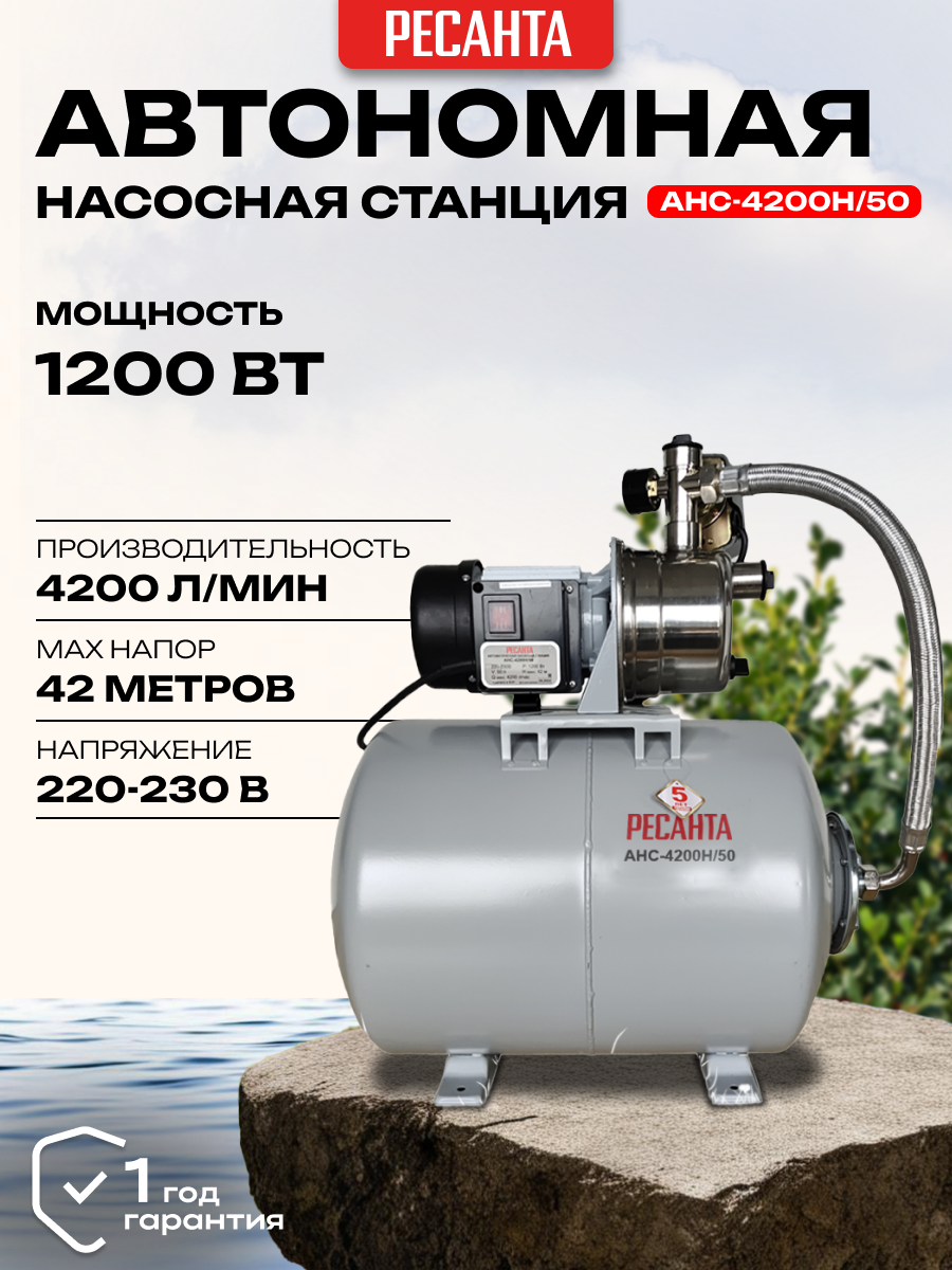 Ниже Вы можете прочитать отзывы на Автономная насосная станция Ресанта АНС-4200Н/50, 1200 Вт, напор – 42 м, 70 л/мин, гидроаккумулятор – 50 л, ознакомится с подробными характеристиками, посмотреть интересные обзоры и фотографии на Автономная насосная станция Ресанта АНС-4200Н/50, 1200 Вт, напор – 42 м, 70 л/мин, гидроаккумулятор – 50 л.