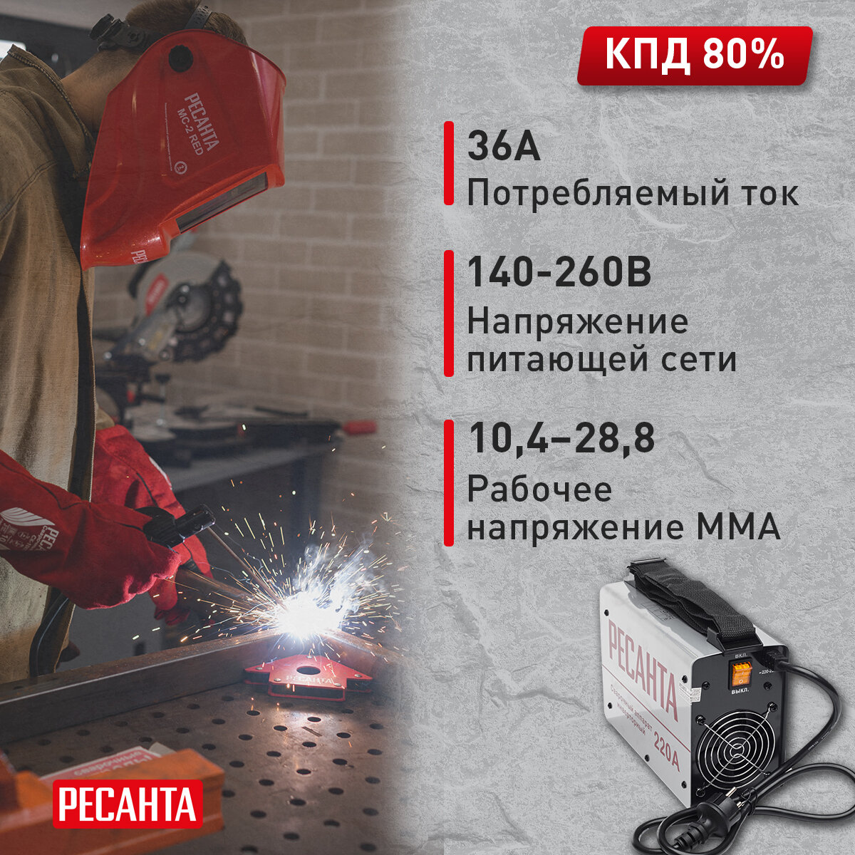 Занимаюсь сбором металлоконструкций, потребовался второй сварочный аппарат выбор пал на РЕСАНТА САИ-220,(до этого был советский 15кг вес, здоровый) удовлетворял своими заявленными характеристиками, не прогадал, отлично проваривает швы электродом пятеркой, за все время работы не одного перегрева, удобно лазить по лесам с ним, легкий вес компактный размер через плече бросил и погнал. Взял с кейсом удобно хранить т.к. у меня частые разъезды(защищает от пыли ,дождя) Советую. своих денег явно стоит кто бы, что не говорил.