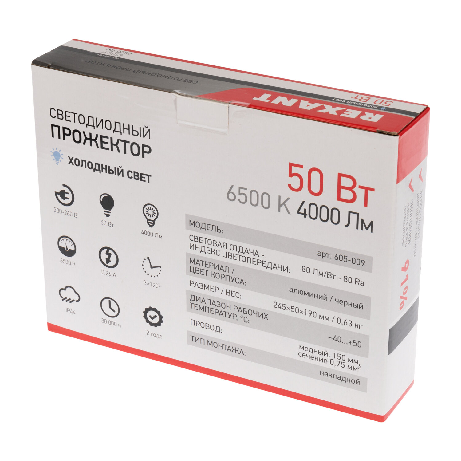 Прожектор светодиодный REXANT 605-009, 50 Вт, свет: холодный белый