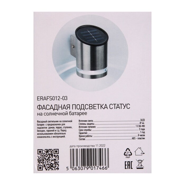 Купить Светильник уличный ERAFS012-03 на солнечной батарее настенный Статус 3 LED, ЭРА Б0057594 (1 шт.)