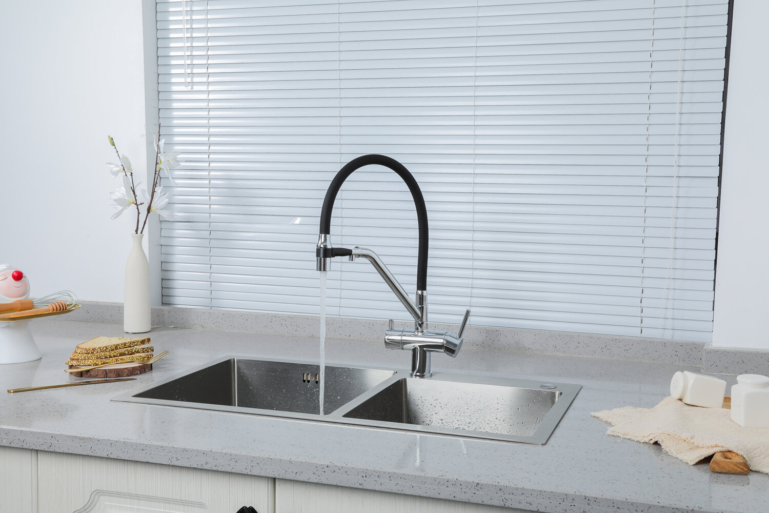 Смеситель для кухни гибкий излив с фильтром для воды Gappo G4398-81, черный/белый гранит