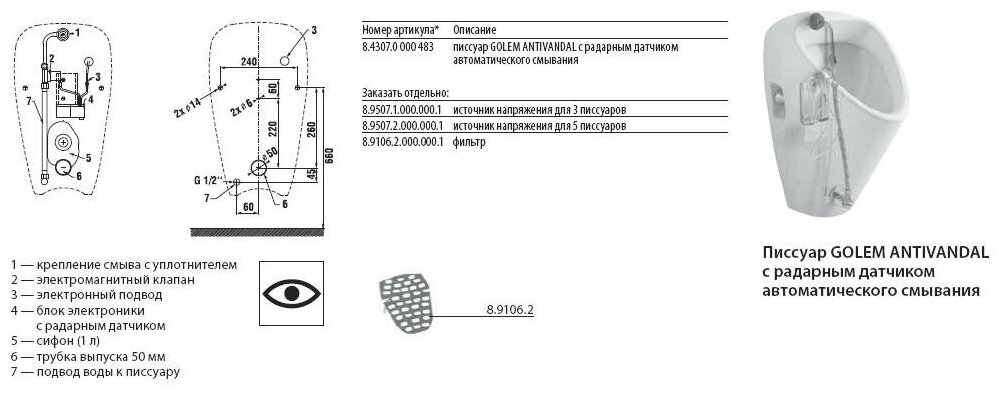 Писсуар Jika Golem, арт. 8430700004831, питание от сети, подвод воды сзади, antivandal, с радарным датчиком