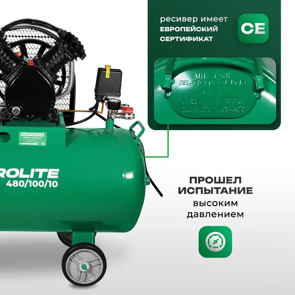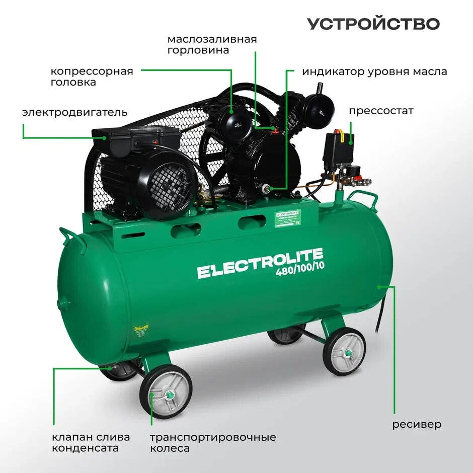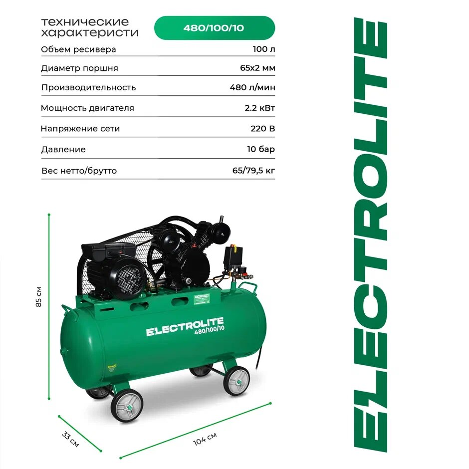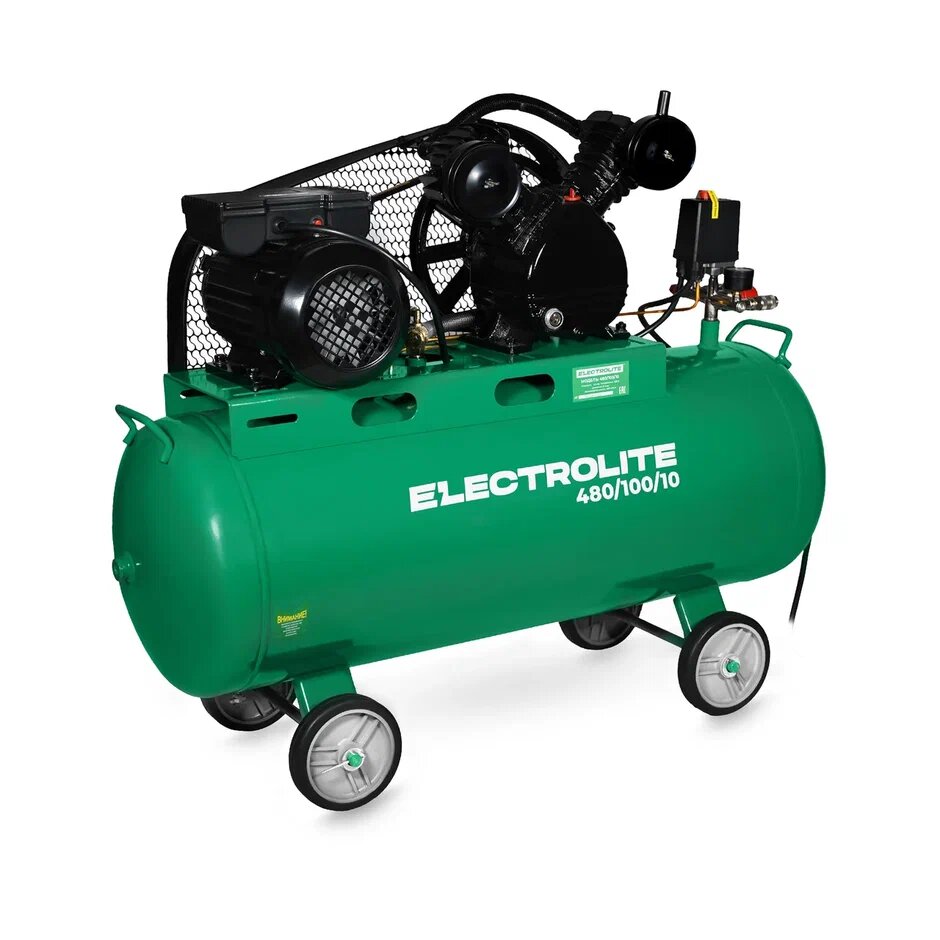 Купить Компрессор воздушный 100л / поршневой / масляный / автомобильный / для гаража Electrolite 480/100/10 ( 480 л/мин, 100 л бак, 2200 Вт, 3 л. с, 10 Атм, 220 В, передвижной, 2-хцилиндровый, 28.8 м3/ч )