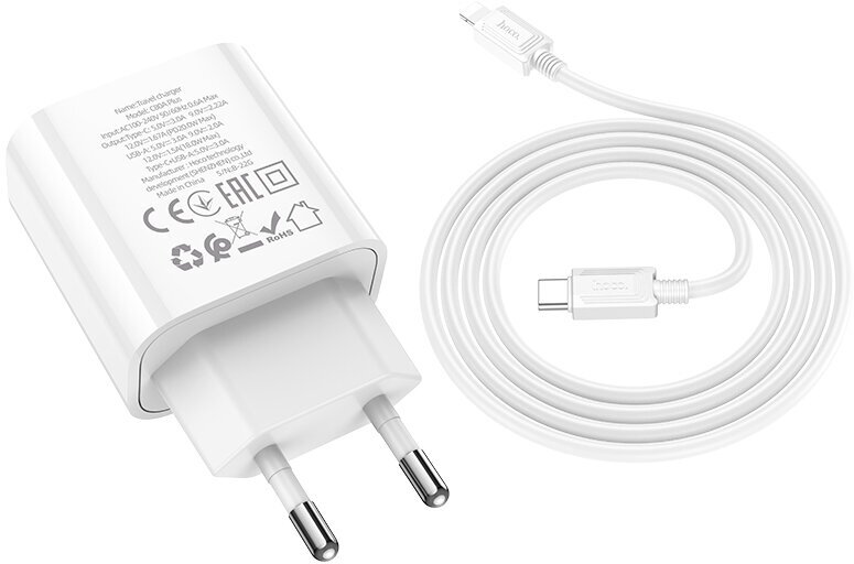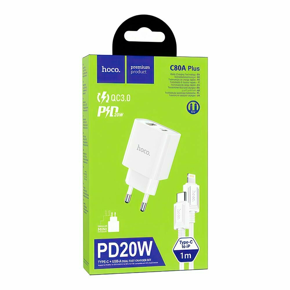 Быстрая зарядка для телефона с разъемами Type-C и USB-A и кабелем type-c to ip PD20W /Hoco C80A Plus PD20W white (EU)