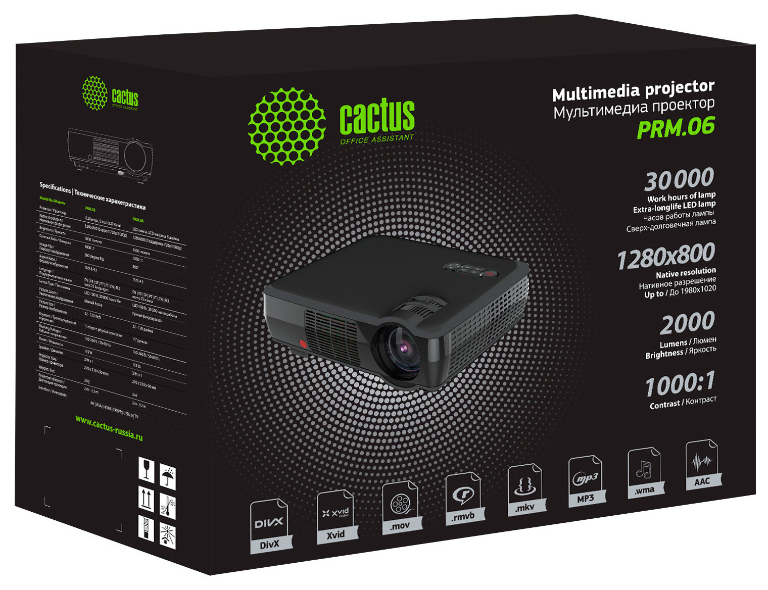 Проектор CACTUS Проектор Cactus CS-PRM.06WT.WVGA-W LCD 2000Lm (1280x800) 1000:1 ресурс лампы:30000часов 2xUSB typeA 2xHDMI 3кг