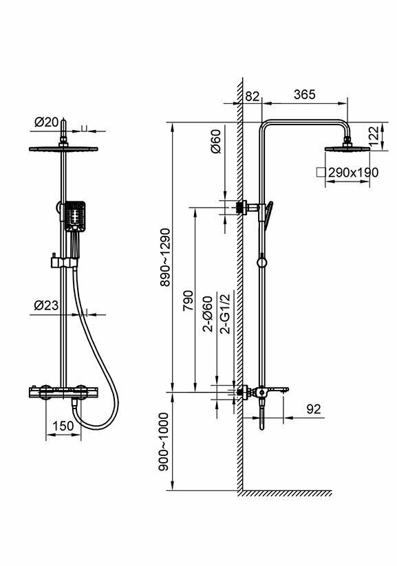 | Комплектация | термостатический смеситель настенного монтажа / телескопическая штанга / ручной душ / гибкий металлический шланг / регулируемый по высоте верхний душ / эксцентрики / чаши декоративные |