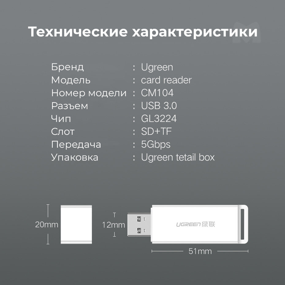 СохранитьКардридер UGREEN CM104 USB 3.0 to TF, SD Dual Card Reader, цвет белый (40753) интересное: