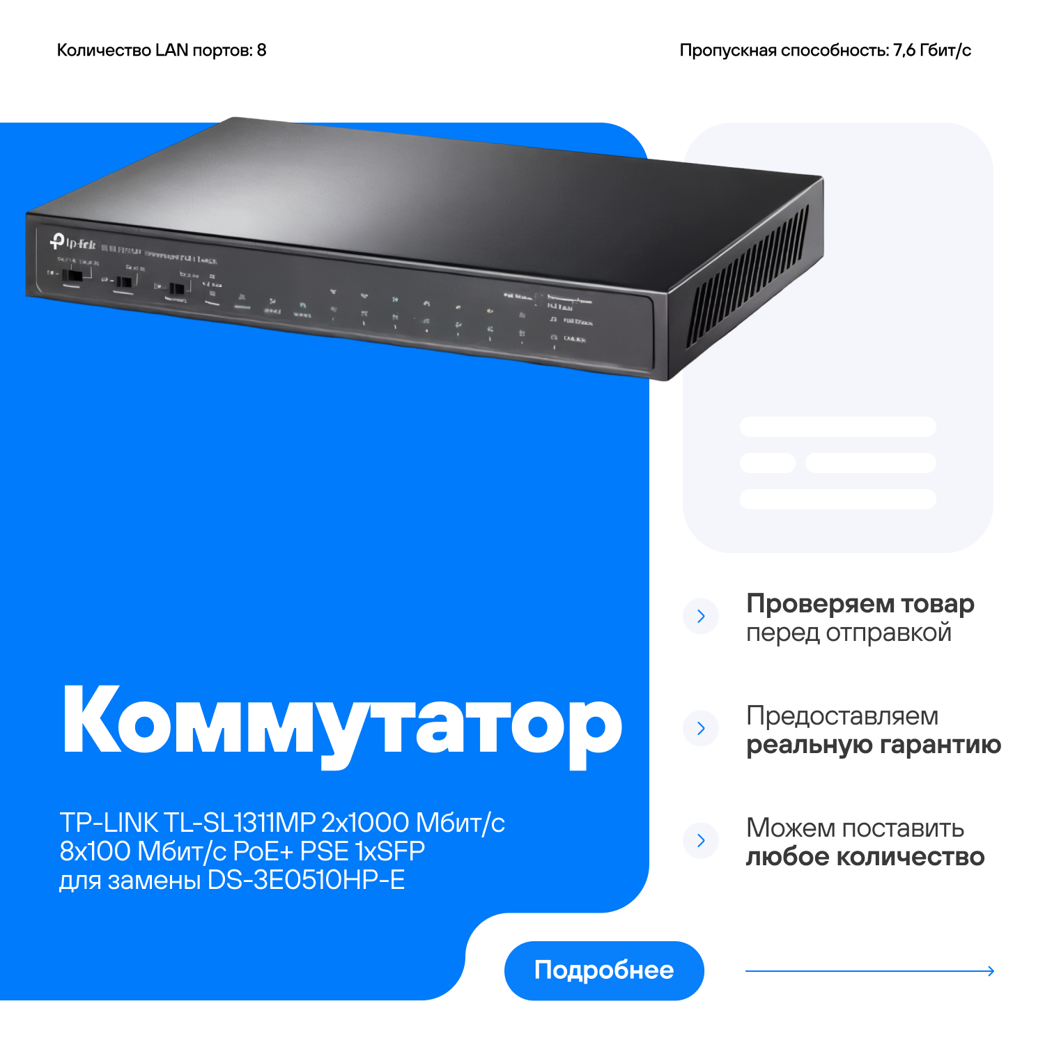 Коммутатор TP-LINK TL-SL1311MP 2х1000 Мбит/с 8х100 Мбит/с PoE+ PSE 1xSFP совместим для замены с DH-CS4210-8GT интересное: