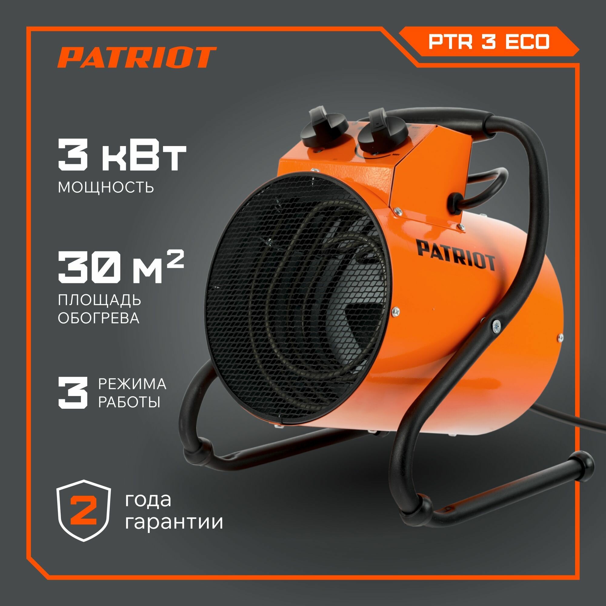 Тепловентилятор электрический PATRIOT ECO-R 3, 220В, терморегулятор, нерж.ТЭН, шнур с евровилкой / портативный обогреватель / бытовой / тепловая пушка