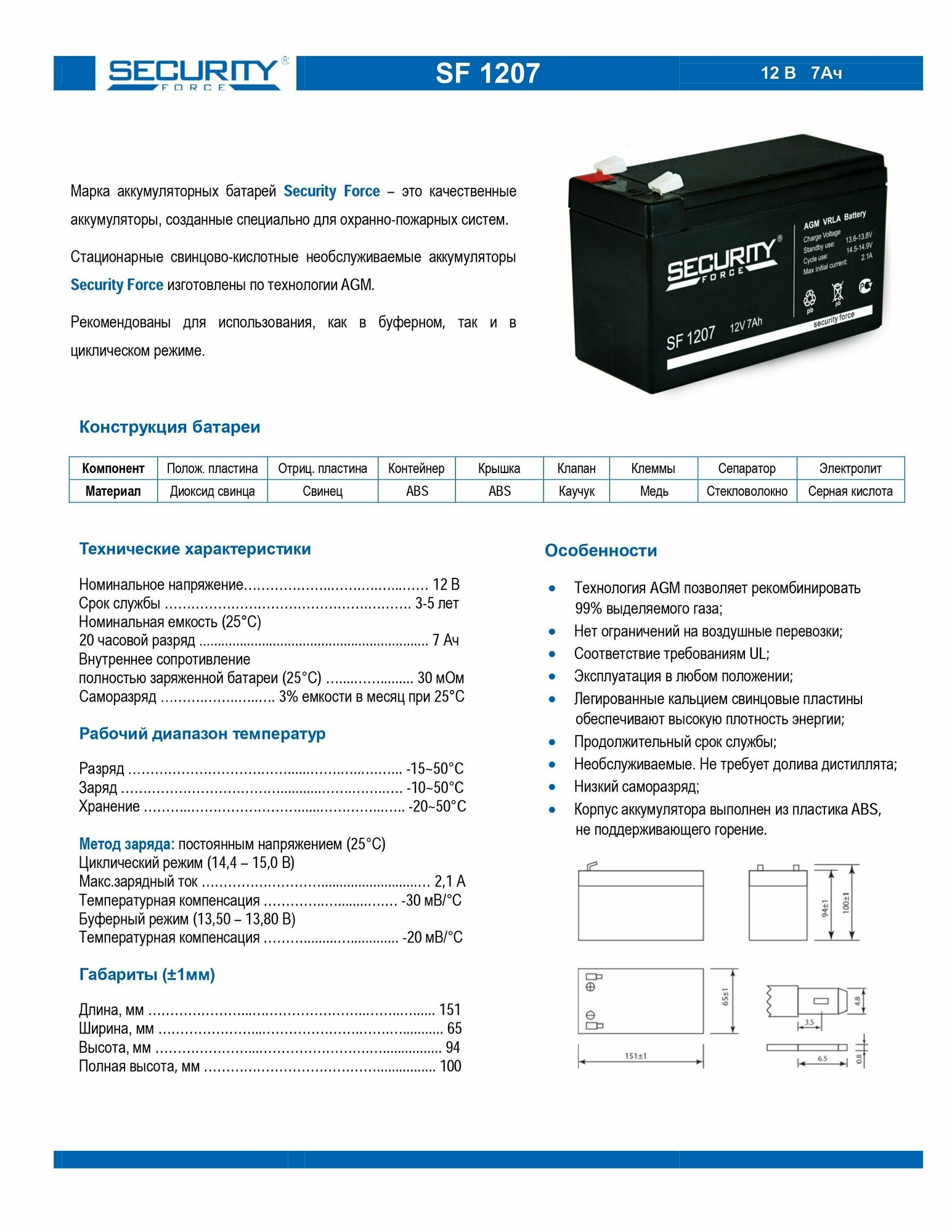 АКБ ИБП 12 В 7 А/ч п.п. Security Force AGM 151 х 34 х 100 SECURITY FORCE SF 1207 | цена за 1 шт