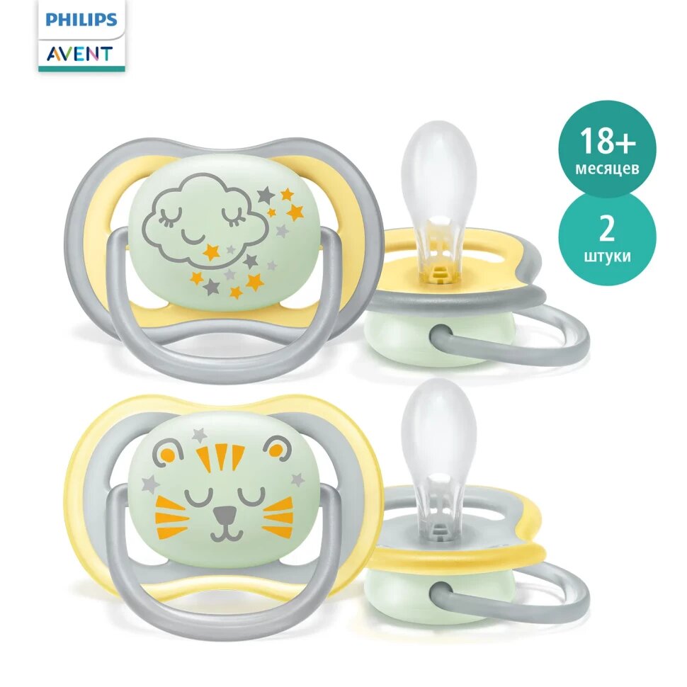Купить Светящаяся соска-пустышка Philips Avent ultra air night SCF376/01 силиконовая, с футляром для хранения и стерилизации, 18 мес +, 2 шт