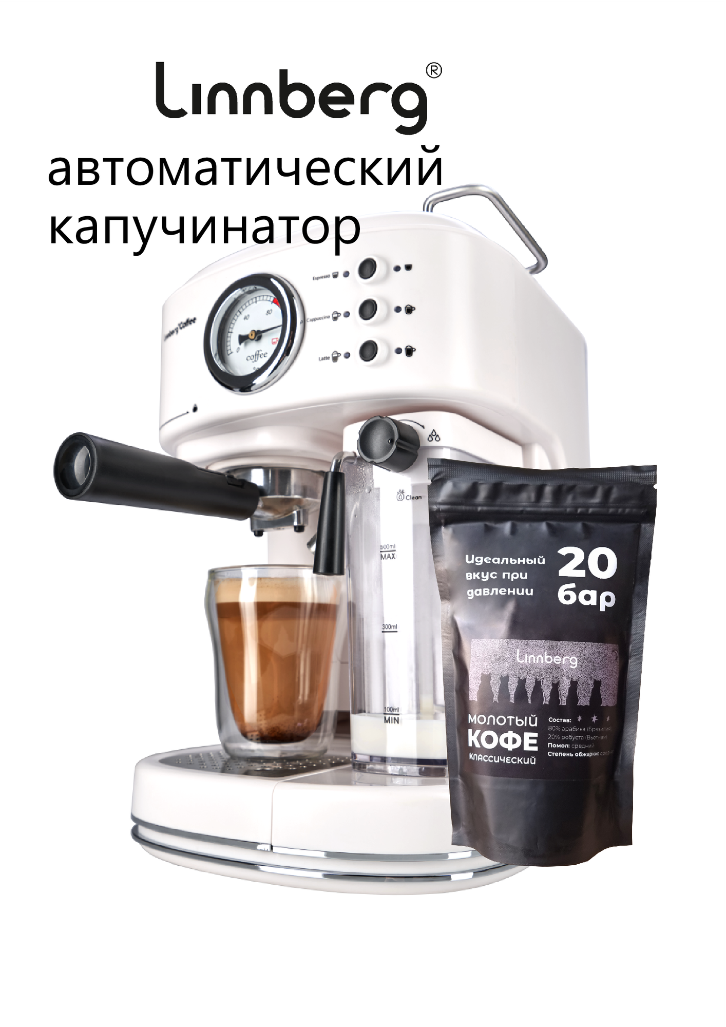 Linnberg / Кофеварка (кофемашина) рожковая Linnberg Coffee, давление - 20 бар, эспрессо, капучино и лате