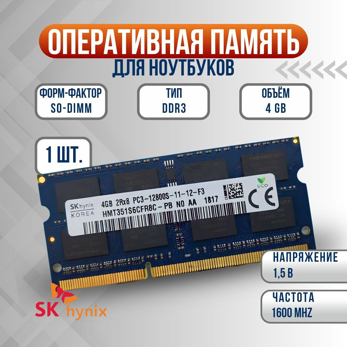 Оперативная память SK Hynix 4 ГБ DDR3 1600 МГц SODIMM CL11 HMT351S6CFR8C-PB