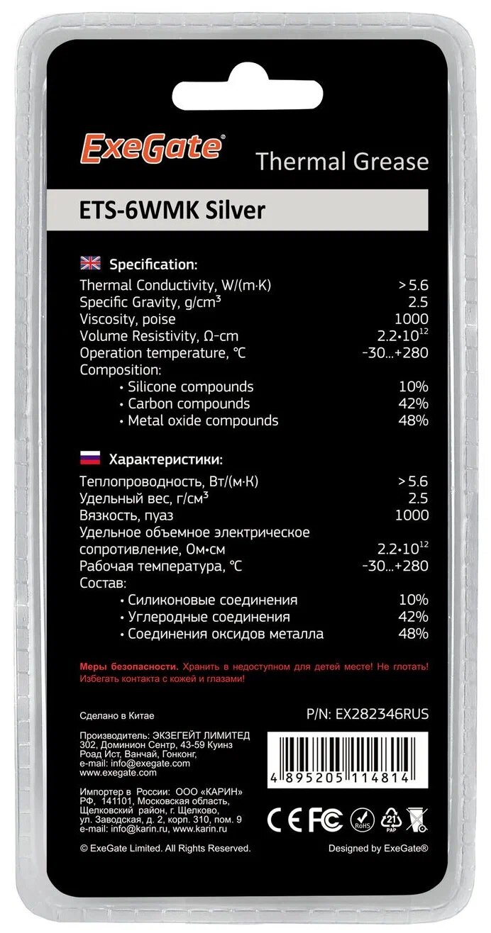 EXEGATE Термопаста EX282348RUS Термопаста ETS-6WMK Silver, шприц с лопаткой, 8г
