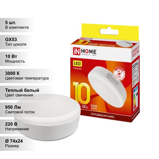 Купить (5 шт.) Светодиодная лампочка IN HOME 10Вт 230В 3000К GX53