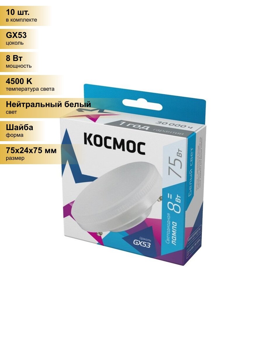 Купить (10 шт.) Светодиодная лампочка Космос GX53 св/д 8W(740lm) 4500K 4K 24x75 матов. Lksm_LED8wGX5345C Нейтральный белый. Цоколь GX53