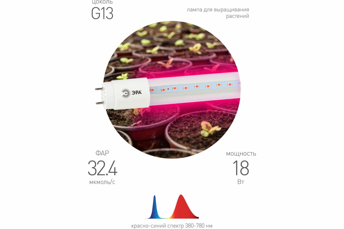 Лампа для растений, сине-красный спектр, 18 Вт, Т8 1200 мм, 32,4 мкмоль/с, цоколь G13, эра 4839262 .