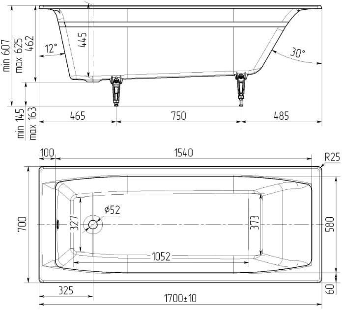 Чугунная ванна Luxus Crystal 170x70 с отверстиями для ручек