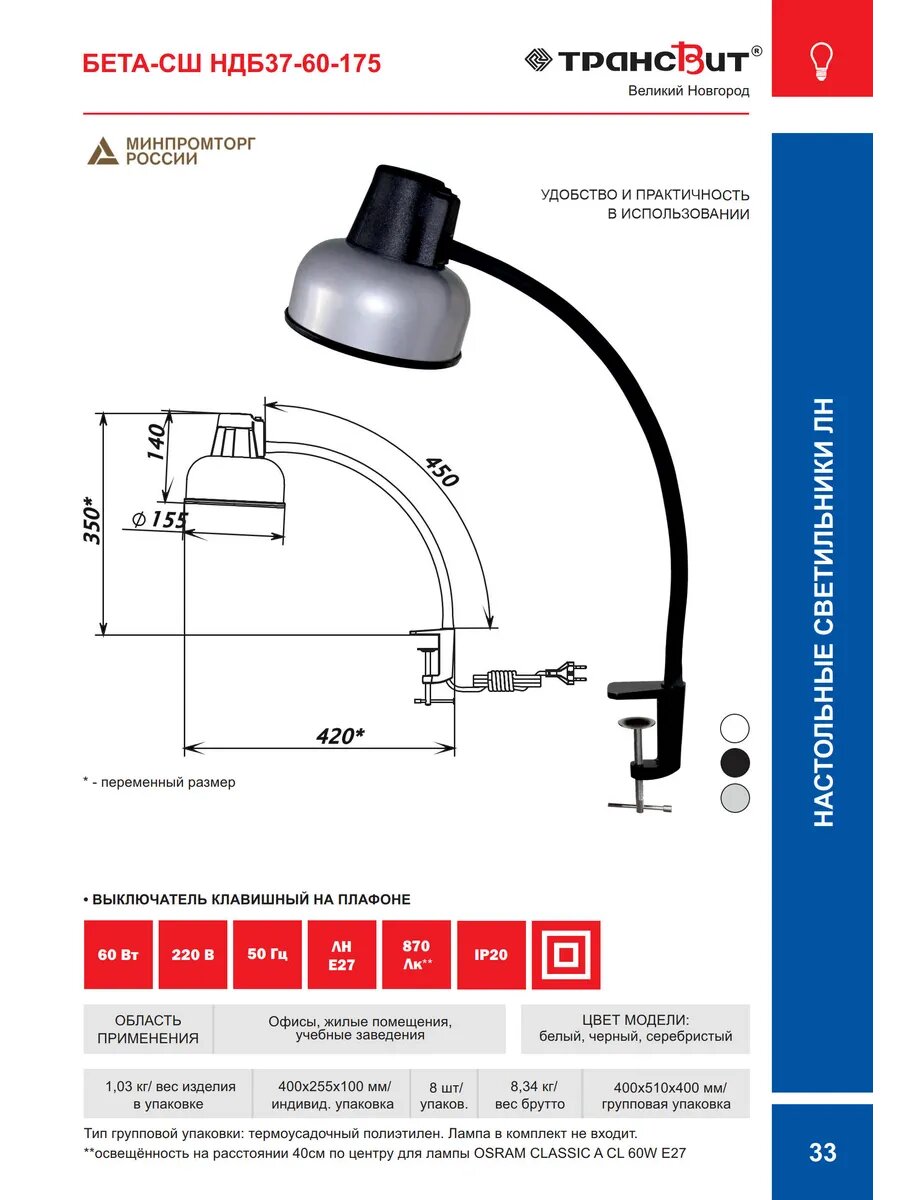 СохранитьНастольная лампа на струбцине светильник Бета СШ НДБ37-60-175 черный E27 220В Трансвит интересное: