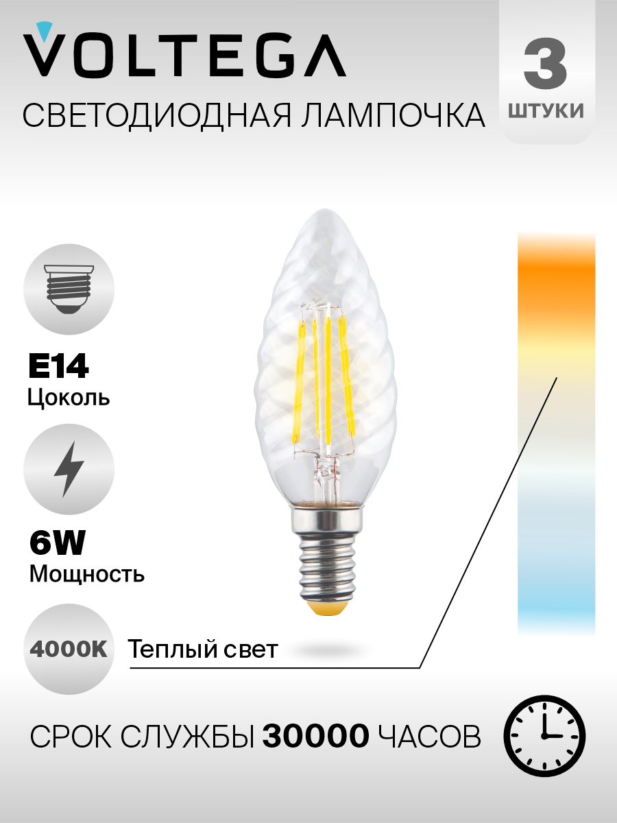 Купить Лампочка светодиодная E14 форма свеча на ветру 6W нейтральный свет Voltega Crystal Candle 4000K упаковка 3 штуки