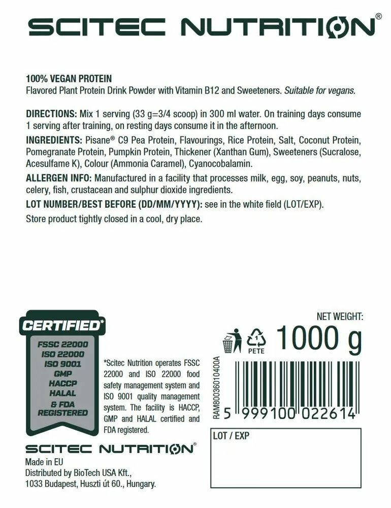 | Дополнительная информация | рекомендации по применению: принимайте одну порцию в день (33 грамма, 3/4 мерной ложки), смешивая с 300 мл воды. В дни тренировок используйте после тренировки; в дни отдыха употребляйте во второй половине дня; состав: органическая белковая смесь веганского белка (изолят белка Pisane® C9, белок риса, белок кокосового ореха, белок из граната, тыквенный белок), ароматизаторы (фундук, ириска), хлорид натрия, подсластитель (стевиол гликозиды) |