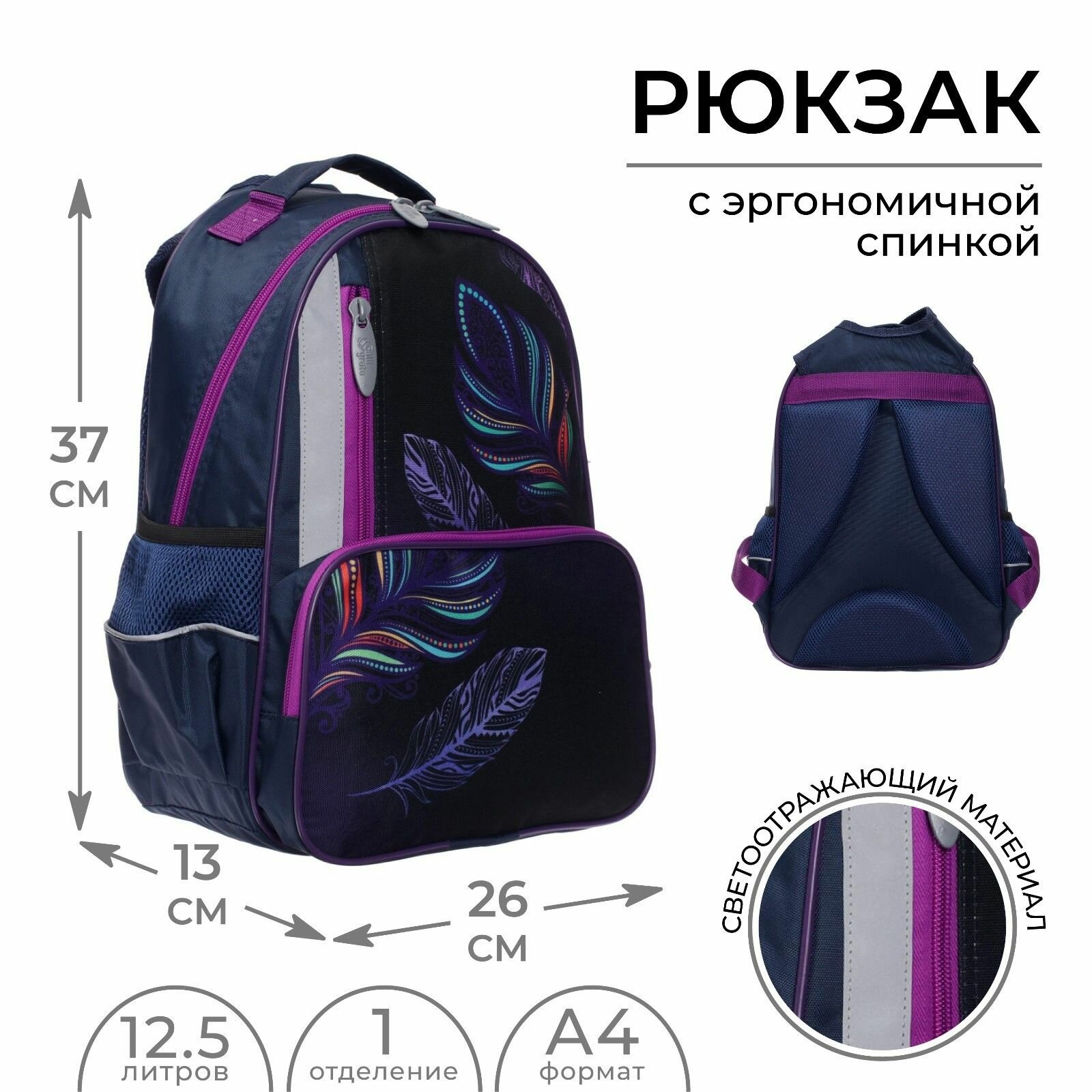Рюкзак школьный, Calligrata, 37 х 26 х 13 см, эргономичная спинка, Пёрышко